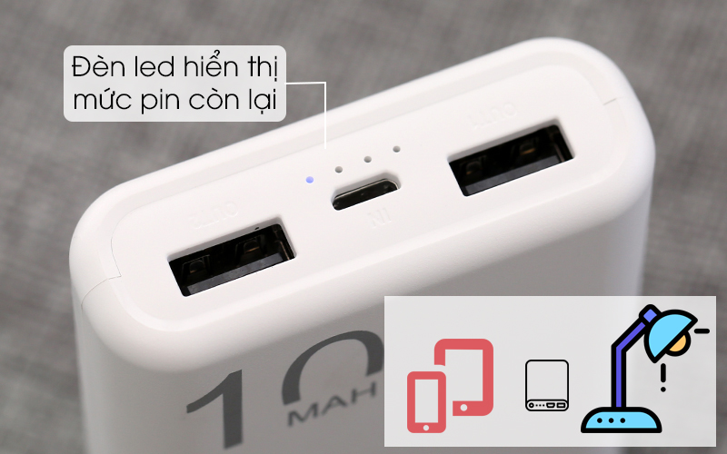 Pin sạc có thể sạc đồng thời cho 2 thiết bị cùng lúc và sạc được cho nhiều thiết bị khác nhau, như thiết bị nghe/gọi, loa mini, đèn bàn,...