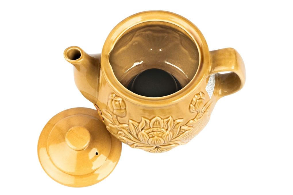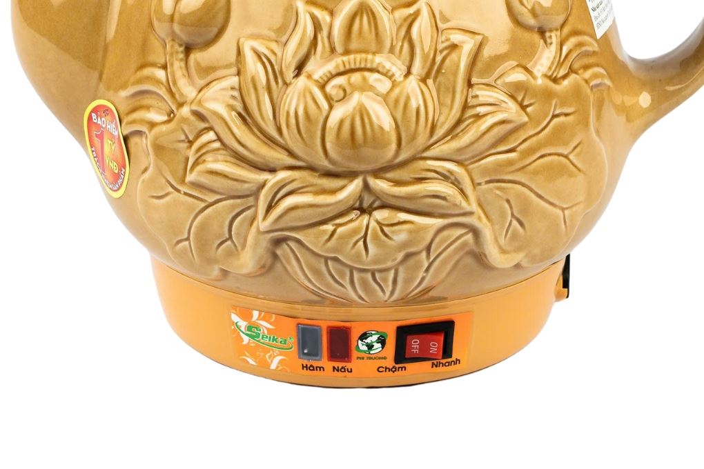 Siêu sắc thuốc điện Seika 3.2 lít SKS 328 Vàng mang kiểu dáng siêu sắc thuốc truyền thống với tông vàng đặc trưng, trên thân ấm nổi bật họa tiết đóa hoa sen đắp nổi, tạo cảm giác gần gũi và mang hơi hướng phong thủy, rất hợp đặt trong gian bếp gia đình Việt. Thân và nắp đều được chế tác từ gốm sứ Bát Tràng, giữ nhiệt tốt và an toàn khi sử dụng lâu dài với dược liệu.