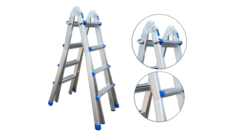 - Thang nhôm có thiết kế gấp với nhiều tư thế khác nhau như I, A,… nên có thể đặt trên địa hình bằng phẳng mà không cần điểm tựa.