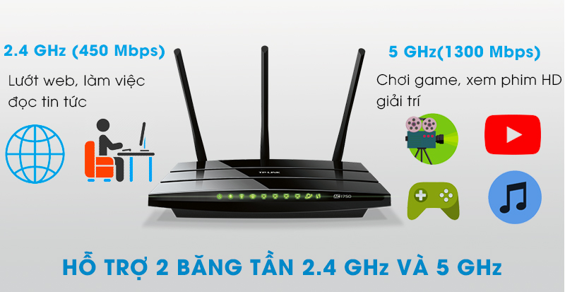 Router TP-Link Archer C7 AC1750 băng tần kép được hỗ trợ chuẩn wifi AC mới nhất cho tốc độ cực nhanh 1300 Mbps ở băng tần 5 GHz và 450 Mbps ở băng tần 2.4 GHz. Là sự lựa chọn tuyệt vời đáp ứng mọi nhu cầu sử dụng internet từ chơi game online đồ họa cao cho đến xem video trực tuyến độ phân giải cao.