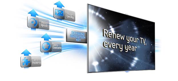 Luôn đưa tivi của bạn theo kịp trong cuộc đua công nghệ hàng năm. Bạn có thể dễ dàng nâng cấp hoàn toàn chiếc tivi của mình nhờ Bộ nâng cấp thông minh (Evolution Kit) của Samsung. Bạn chỉ việc cắm sản phẩm vào tivi và tự nó sẽ làm nốt phần việc còn lại. Biến vi xử lý của tivi từ hai nhân lên bốn nhân, biến độ phân giải từ HD thành Full HD. Ngoài ra tivi của bạn cũng được nâng cấp thêm nhiều tính năng và nội dung hơn. Hãy cùng truy cập vào thế giới hoàn toàn mới của những nội dung tương tác và tính năng tuyệt vời của một chiếc tivi "bình cũ rượu mới".