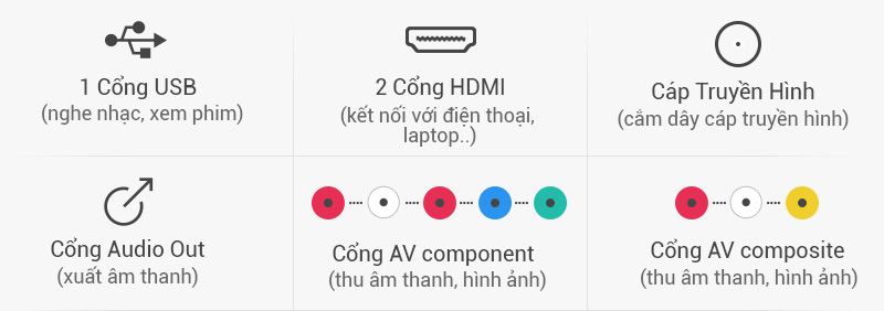 Ngoài ra, nếu muốn kết nối tivi với loa hay dàn âm thanh, bạn có thể dùng jack loa 3.5 mm hay cổng AV Composite, AV Component.