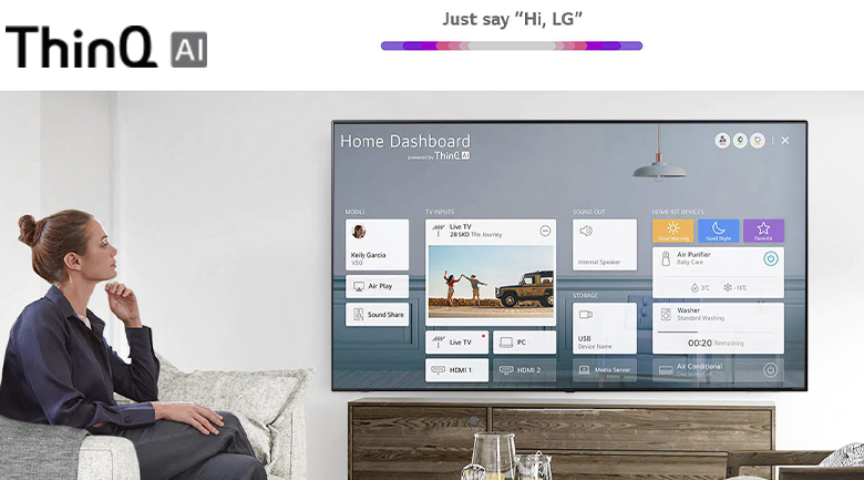 Trí thông minh nhân tạo độc quyền của LG ThinQ AI giúp kết nối và điều khiển các thiết bị điện tử trong gia đình như: Máy lạnh, máy giặt, tủ lạnh,... ngay chính trên chiếc tivi này.