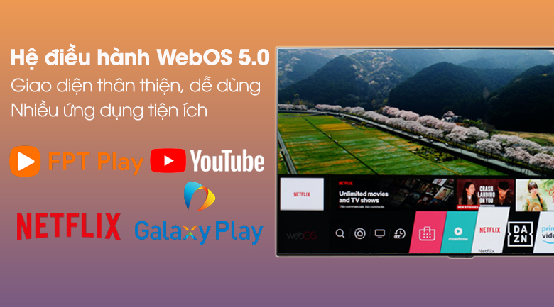 WebOS 6.0 tiên tiến trên tivi LG có giao diện thân thiện, dễ sử dụng, thư viện ứng dụng phong phú với nhiều ứng dụng phổ biến như YouTube, Netflix, FPT Play, Galaxy Play,... phù hợp với mọi thành viên trong gia đình bạn.