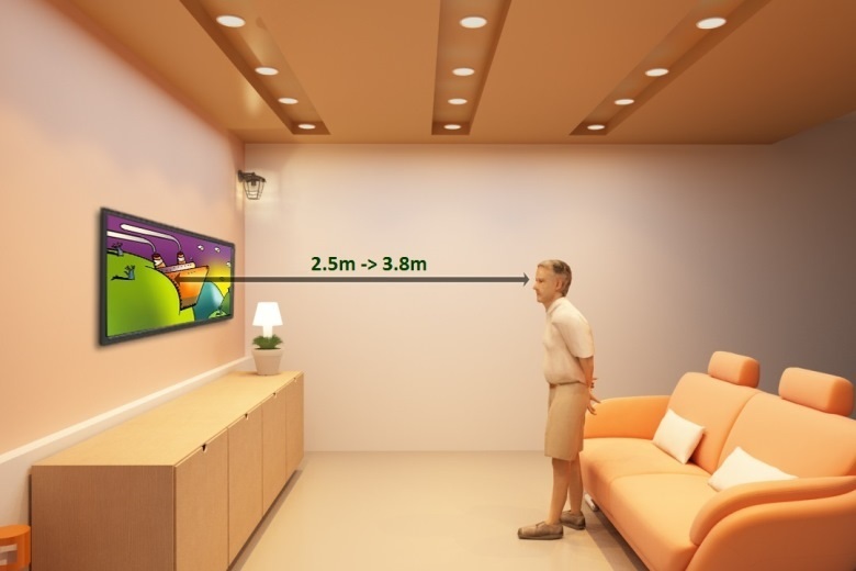Tivi này màn hình 50 inch do đó bạn nên xem tivi ở khoảng cách từ 2.5 m đến 3.8 m để đảm bảo thưởng thức được trọn vẹn chương trình tivi mà không gây hại mắt.