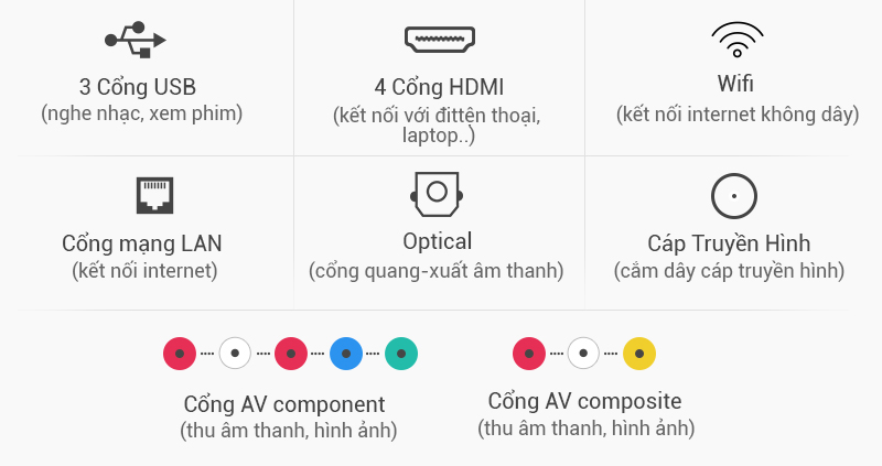 Trên tivi có đầy đủ các cổng kết nối: USB, HDMI, Optical, AV Composite, AV Component. Đặc biệt các cổng kết nối này không nằm mặt sau tivi mà được tập trung trên 1 thiết bị gọi là ONE CONNECT đi kèm tivi (nhằm đảm bảo độ mỏng cho tivi).