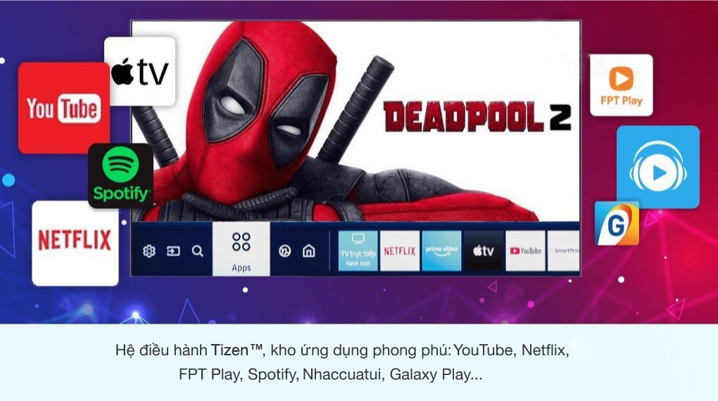 Tivi SamSung QLED trang bị hệ điều hành Tizen OS 5.5 có giao diện đơn giản và dễ sử dụng. Kho ứng dụng có sẵn: YouTube, Netflix,... và có thể tải thêm những ứng dụng khác mà bạn yêu thích như: Spotify, Galaxy Play, Clip TV,... để phục vụ cho nhu cầu giải trí của cả gia đình.