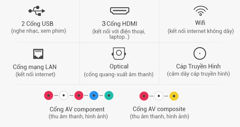 Nếu muốn kết nối Smart Tivi Skyworth GLED 43 inch 43K920S với loa, dàn máy bạn có thể dùng cổng Optical hay cổng AV (jack bông sen).
