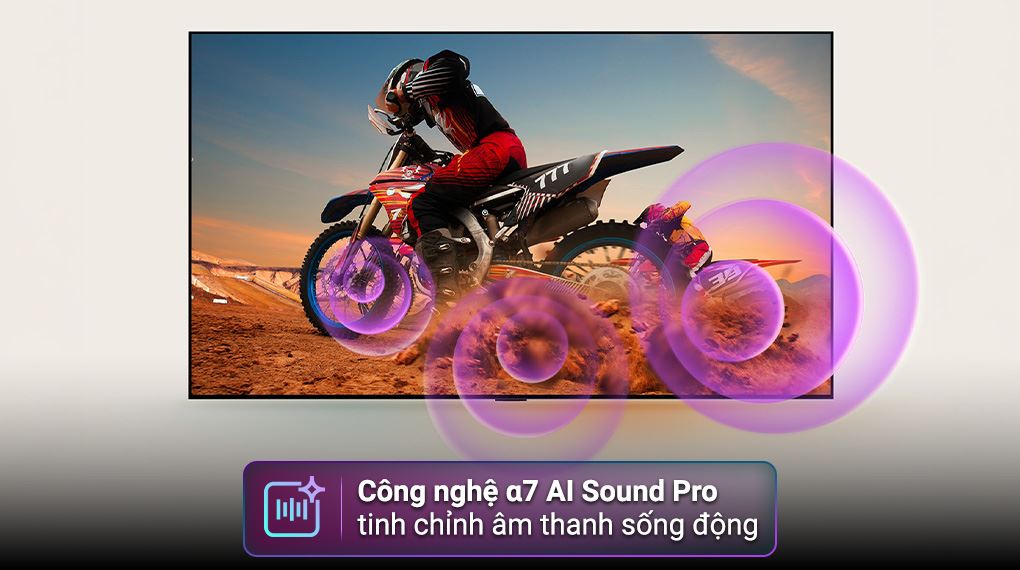 Tivi được trang bị hệ thống 2 loa với tổng công suất 20W, kết hợp công nghệ α7 AI Sound Pro, mô phỏng hiệu ứng âm thanh vòm 9.1.2 giả lập, mang đến trải nghiệm âm thanh sống động, sâu lắng và bao trùm khắp không gian.