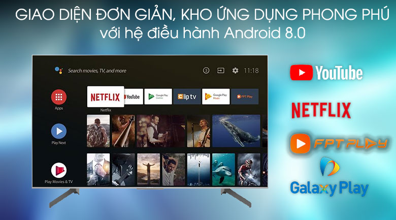 Android tivi Sony được cài sẵn nhiều ứng dụng như: YouTube, Google Play, Netflix, Trình duyệt web,... Ngoài ra bạn có thể tải thêm một số ứng dụng khác như: FPT Play, ClipTV, Nhạc của tui, Spotify, VTV Go, Game Asphalt 8,... để nâng cao trải nghiệm giải trí trên tivi ngay tại nhà bạn.