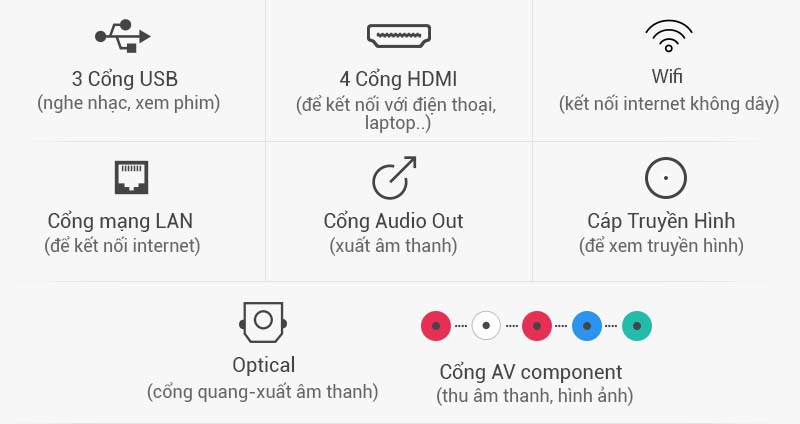 Tivi có đa dạng cổng kết nối như HDMI, USB, Optical,… giúp kết nối với nhiều thiết bị giải trí khác như laptop, USB, loa... Ngoài ra, tivi còn có thể kết nối với chuột, bàn phím nhưng chưa kết nối tốt lắm, do đó, bạn có thể sử dụng điện thoại để thao tác và nhập liệu nhanh chóng hơn.