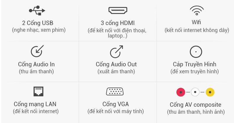 Ngoài các kết nối quen thuộc như HDMI, USB, AV, Audio Out… thì chiếc tivi này có ưu điểm là hỗ trợ tốt kết nối chuột, bàn phím. Thêm nữa, khi bạn sử dụng Skype, tivi cho phép kết nối dễ và không kén camera.