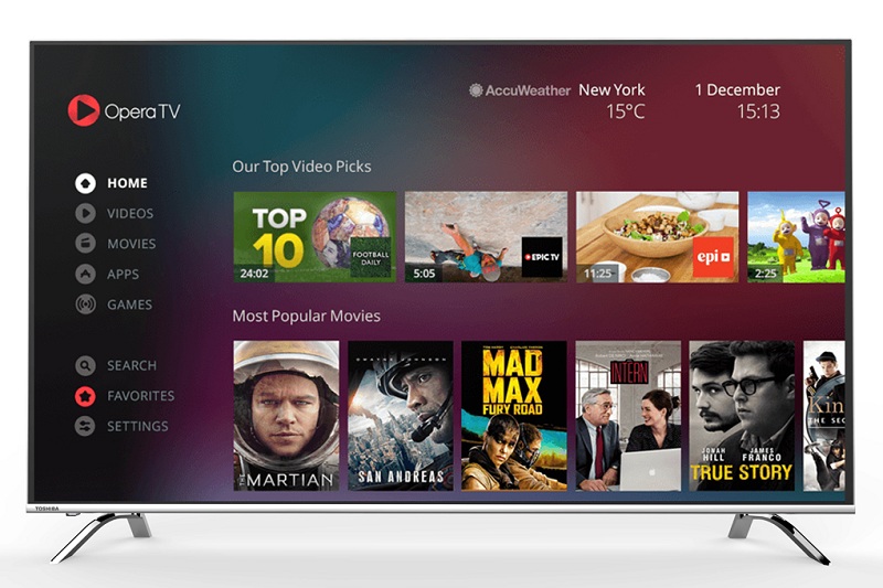 Smart tivi Toshiba được trang bị giao diện Opera TV cùng hàng loạt ứng dụng giải trí nổi bật: Trình duyệt web, YouTube, Zing TV, Zing MP3, Nhạc của tui..., giúp bạn có những giờ phút giải trí thoải mái bên gia đình, bạn bè sau những ngày làm việc căng thẳng.