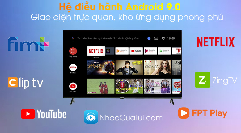 Android tivi Vsmart sở hữu kho ứng dụng phong phú đa dạng với các ứng dụng sẵn có và có thể tải thêm như : FPT Play, Clip TV, Youtube, Netflix,...đáp ứng đầy đủ các nhu cầu giải trí của cả gia đình.