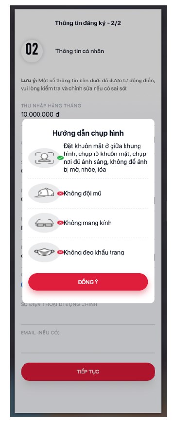 - Bước 10: Sau khi Chụp hình chân dung thành công, điền các thông tin còn thiếu và bấm “Tiếp tục”