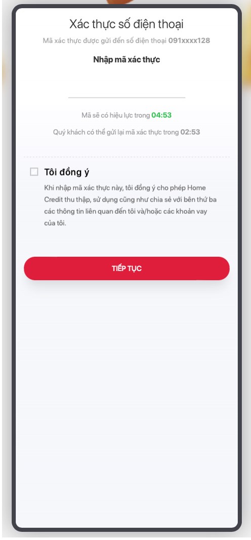 >>> Khách hàng nhập OTP đã được gửi qua điện thoại, chọn “Tôi đồng ý” sau đó bấm "Tiếp tục"