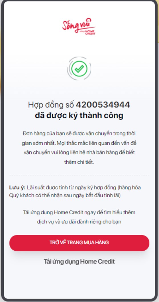 Trường hợp không nhận được link, anh/chị vui lòng download ứng dụng HomeCredit (AppStore/Google Store) để ký hợp đồng.
