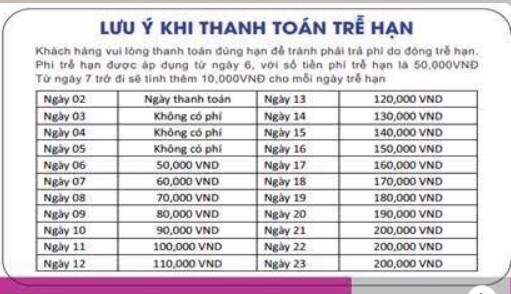 Ngày trễ thanh toán Phí phát sinh Ngày 1 đến ngày 5 Không phát sinh phí Ngày 6 đến ngày 23 50.000vnđ (mỗi ngày phát sinh thêm 10.000vnđ)