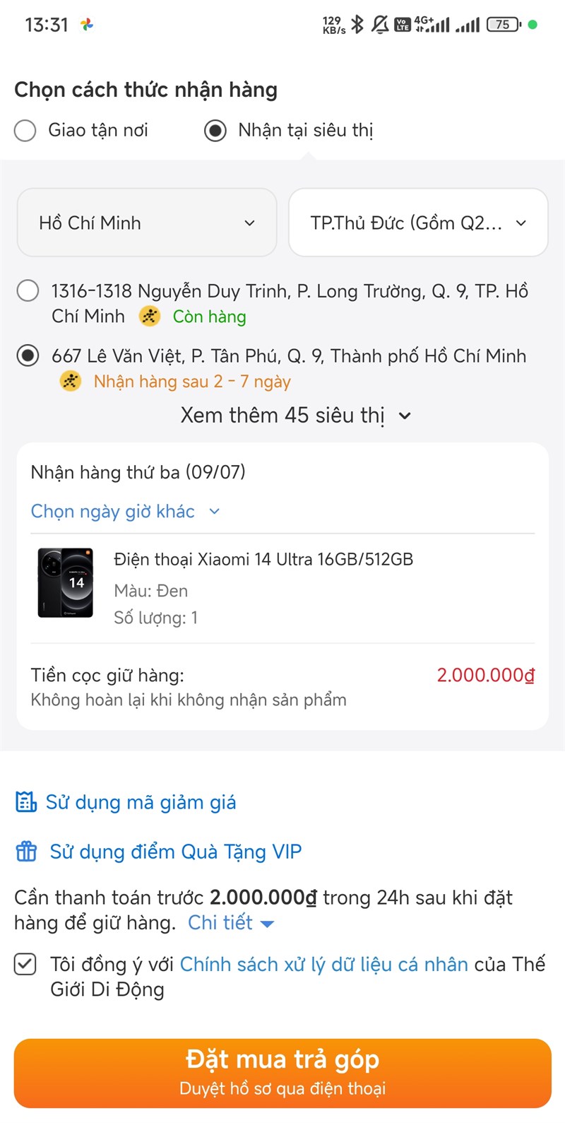 - Bước 2: Kiểm tra lại thông tin gói Trả chậm đã chọn => Khách hàng điền thông tin cá nhân và chọn cách thức nhận hàng (Giao tận nơi hoặc Nhận tại siêu thị) => Cuối cùng Bấm nút "Đặt mua trả chậm - Duyệt hồ sơ qua điện thoại"