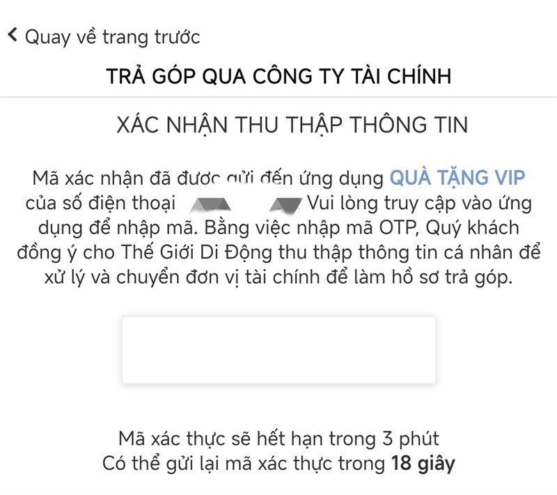- Bước 3: Nhập mã OTP được gửi về SĐT mua hàng hoặc app Quà tặng VIP