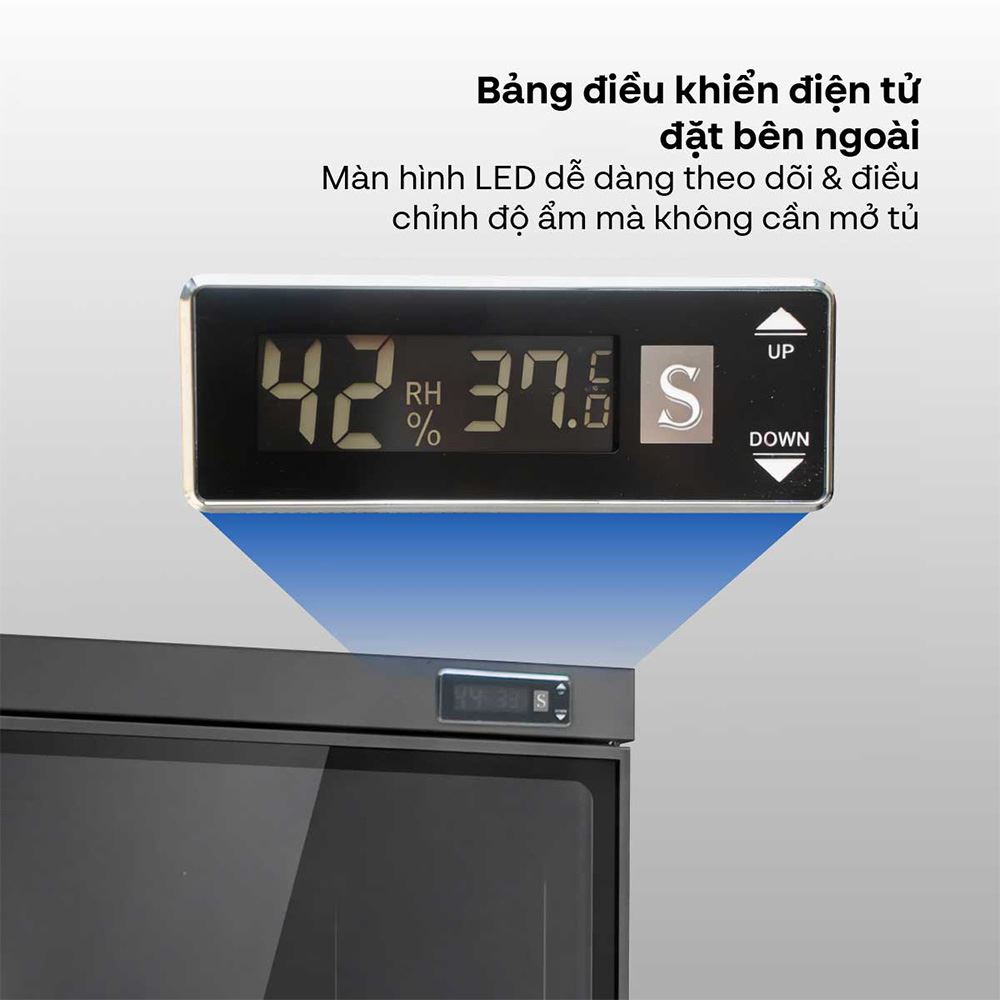 Phiên bản DHC500 được nâng cấp bảng điều khiển điện tử đặt bên ngoài, giúp người dùng dễ dàng điều chỉnh mà không cần mở tủ. Tủ tích hợp 2 đồng hồ kỹ thuật số hiển thị độ ẩm và nhiệt độ cho từng khoang riêng biệt, kết hợp màn hình LED rõ nét, giúp theo dõi chính xác và thao tác nhanh chóng.