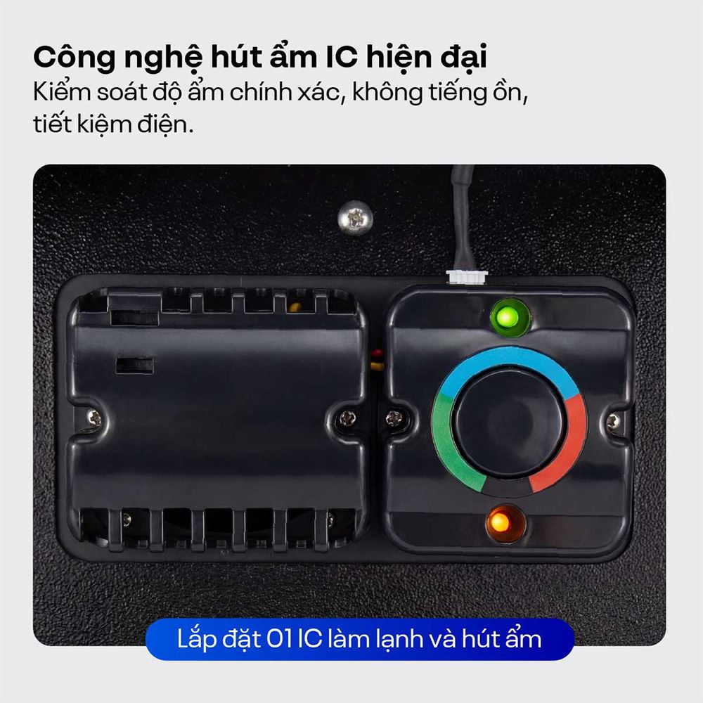 Tủ được trang bị công nghệ hút ẩm IC (1 Block chạy bằng 1 IC), vận hành dựa trên cơ chế làm lạnh để ngưng tụ hơi ẩm trong không khí mà không cần đến máy nén hay các chất hút ẩm truyền thống. Nhờ đó, thiết bị hoạt động cực kỳ êm ái, hạn chế rung lắc, không phát sinh tiếng ồn khó chịu và đồng thời tối ưu điện năng tiêu thụ, phù hợp cho nhu cầu sử dụng liên tục trong thời gian dài.