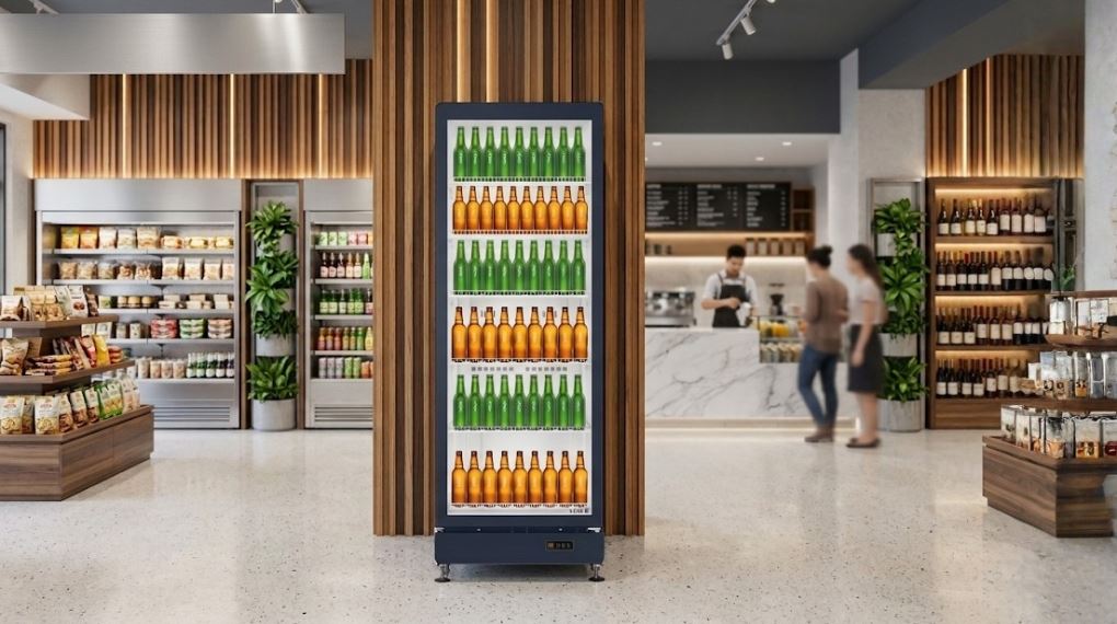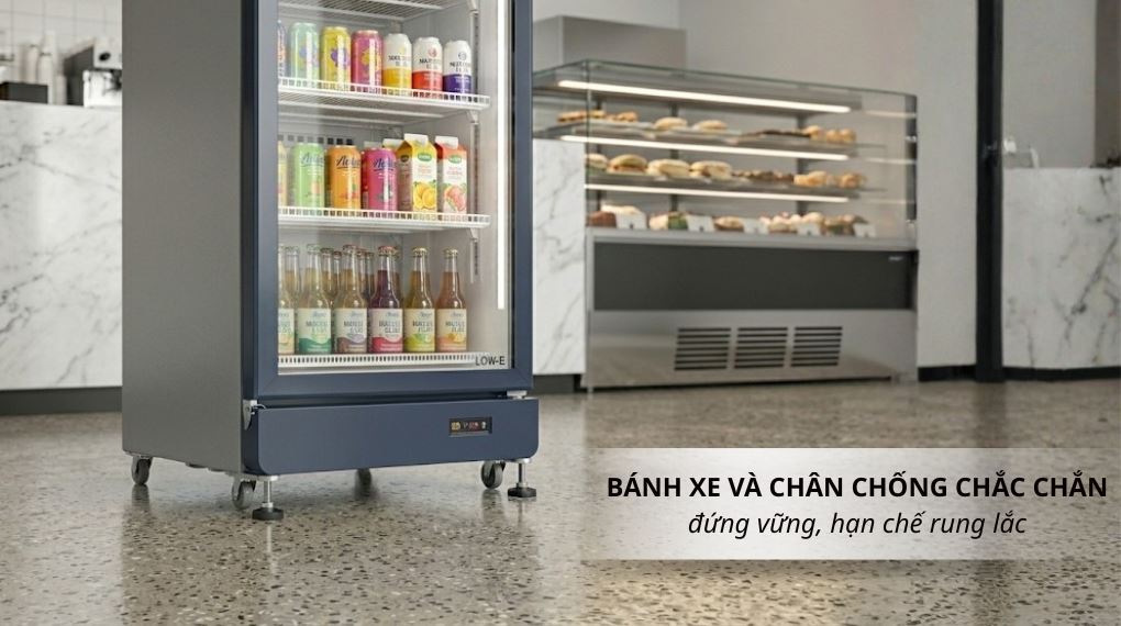 Tủ mát sở hữu thiết kế dạng đứng với 1 cửa kính lớn, hỗ trợ quan sát và trưng bày thực phẩm, đồ uống bên trong mà không cần mở cửa nhiều lần. Mặt kính sử dụng chất liệu cách nhiệt Low-E nên tránh được tình trạng thất thoát nhiệt, đồng thời tăng hiệu quả giữ lạnh.