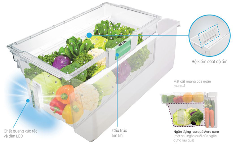 Để tăng thời gian duy trì mức độ tươi ngon mà vẫn đảm bảo còn đủ chất dinh dưỡng cao trong rau củ, thương hiệu đến từ Nhật đã áp dụng thành công ngăn chứa rau quả Aero-care gồm chất xúc tác Platinum để bảo toàn nồng độ CO2 cao có sẵn trong các ngăn chứa, chất này được công nhận an toàn cho sức khỏe và có thể giữ độ tươi và độ ẩm rau củ trong 7 ngày đến 95%.
