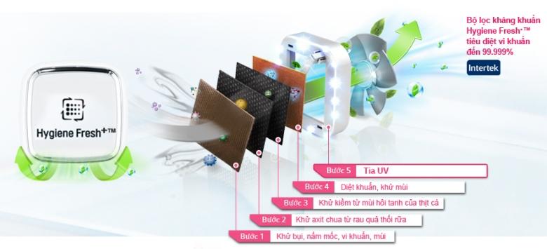 Bộ lọc kháng khuẩn Hygiene Fresh TM của tủ có đến 5 lớp kháng khuẩn và khử mùi hiệu quả, giúp khử bụi, nấm mốc, vi khuẩn, khử axit, khử mùi, khử kiềm từ mùi hôi tanh của thịt cá….Ngoài ra, tia UV giúp gia tăng hiệu quả diệt khuẩn và khử mùi. Nhờ đó, bạn sẽ luôn có được thực phẩm sạch sẽ, tươi ngon, không ám mùi khó chịu. (Xem thêm Ưu điểm của bộ lọc kháng khuẩn Hygiene Fresh TM trên tủ lạnh LG).