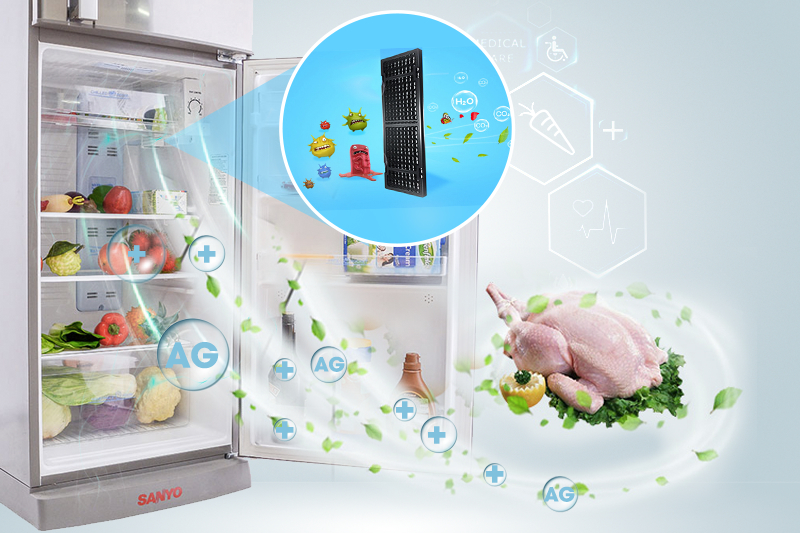 + Công nghệ Nano Fresh Ag+: Công nghệ Nano Fresh Ag+ tạo ra các ion Ag+ hút các ion âm có trong tế bào vi khuẩn, giúp tiêu diệt và khống chế sự hình thành và lây lan của các vi khuẩn có hại, các vi khuẩn gây mùi bên trong tủ lạnh, đảm bảo tủ lạnh luôn ở trạng thái an toàn và không có mùi hôi khó chịu do thực phẩm gây ra.