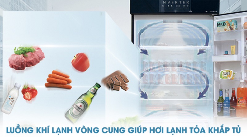 Hệ thống làm lạnh vòng cung sẽ giúp tủ lạnh làm lạnh cho thực phẩm được nhanh và đều hơn nhờ các luồng khí được luân chuyển theo hình vòng cung, làm lạnh đồng đều cho tất cả thực phẩm trong tủ.