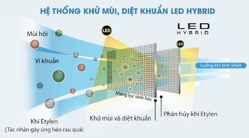 Công nghệ mới kết hợp hiệu quả tối ưu từ công nghệ khử mùi diệt khuẩn LED HYBRID giúp loại bỏ nhanh chóng hiệu quả vi khuẩn gây mùi, phân hủy khí etylen. Tiêu diệt các vi khuẩn gây hại, bảo quản thực phẩm luôn tươi ngon.