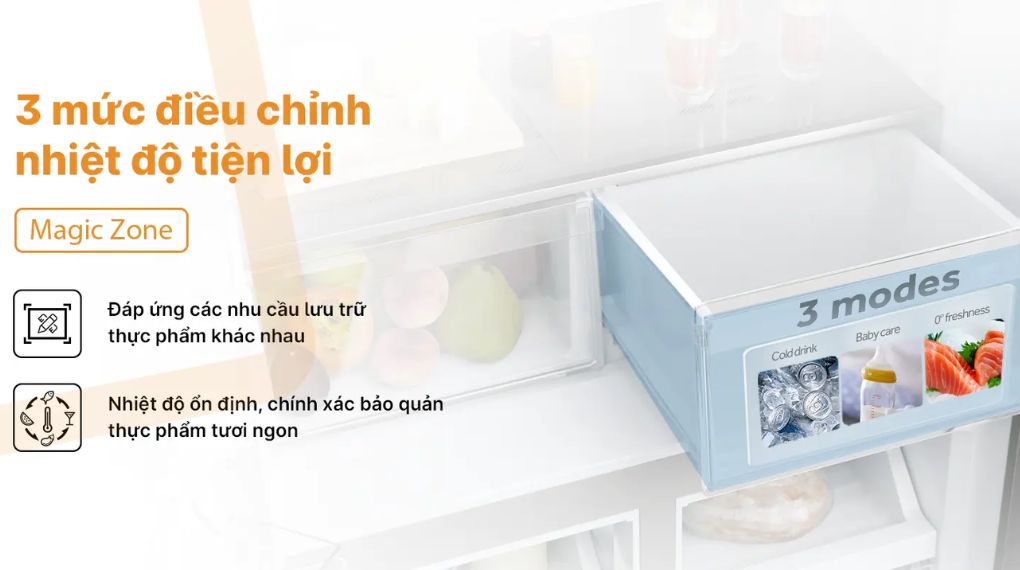 - Ngăn Magic Zone điều chỉnh 3 mức nhiệt độ, đáp ứng đa dạng nhu cầu bảo quản từ rau củ, đồ tươi, đồ uống,...