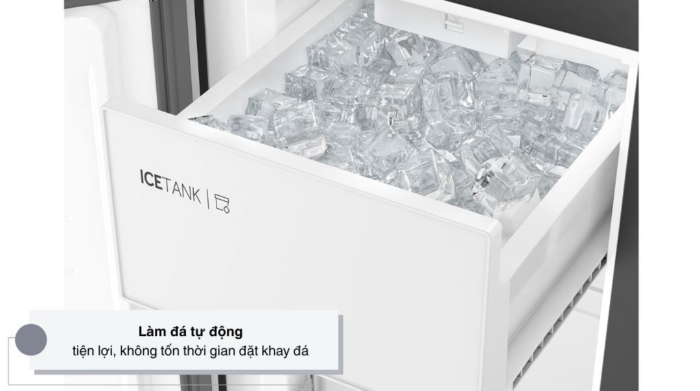 Làm đá tự động là tiện ích khi được cấp vào hệ thống, làm đông và đẩy đá ra khay chứa sẵn, giúp người dùng luôn có đá dùng khi cần, tiện lợi hơn trong sinh hoạt hằng ngày và đặc biệt phù hợp gia đình thường xuyên dùng nước lạnh, giải khát.