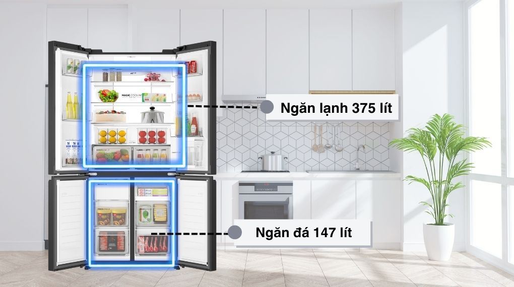 • Dung tích sử dụng 522 lít, thiết kế Multi Door 4 cánh hiện đại phù hợp gia đình 4 - 5 người.