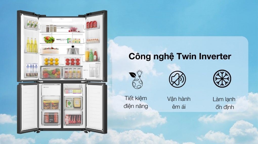 • Tủ lạnh vận hành êm ái và tiết kiệm điện năng nhờ công nghệ Twin Inverter.