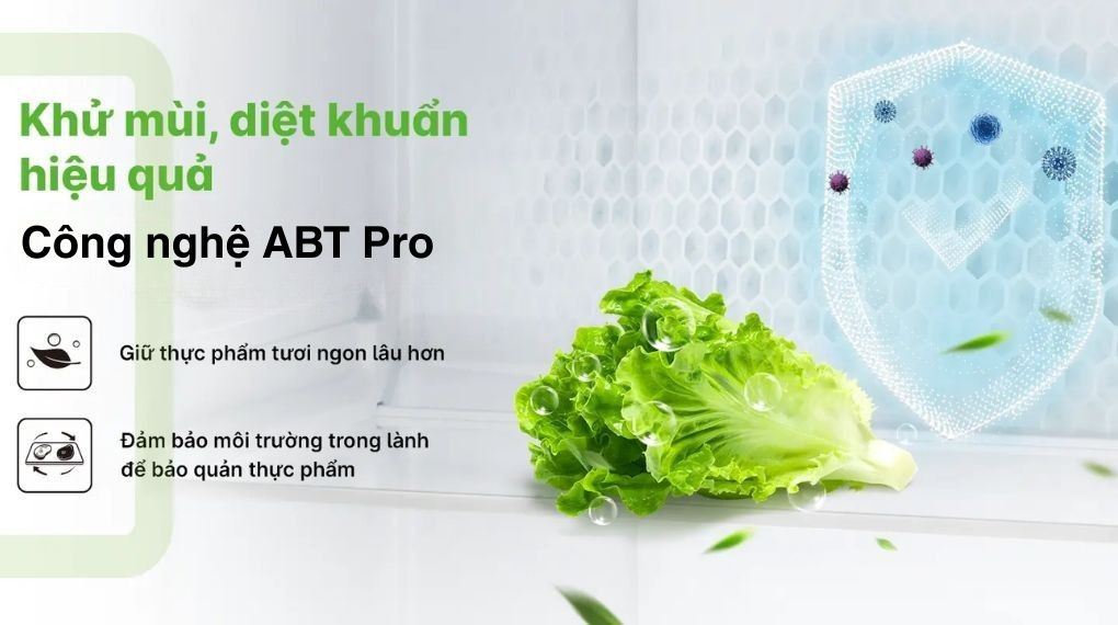 Công nghệ ABT Pro với cơ chế ức chế vi khuẩn gây hư hỏng thực phẩm và giảm bớt mùi khó chịu phát sinh từ thịt cá, đồ ăn nấu chín. Nhờ dòng khí đi qua bộ lọc, mùi hôi được xử lý dần thay vì lan khắp tủ, giúp môi trường bên trong “dễ chịu” hơn mỗi khi mở cửa. Sự kết hợp giữa ABT Pro và hệ thống làm lạnh đa chiều hỗ trợ giữ chất lượng thực phẩm tốt hơn theo thời gian, đặc biệt hữu ích với gia đình thường trữ đồ cho nhiều ngày.