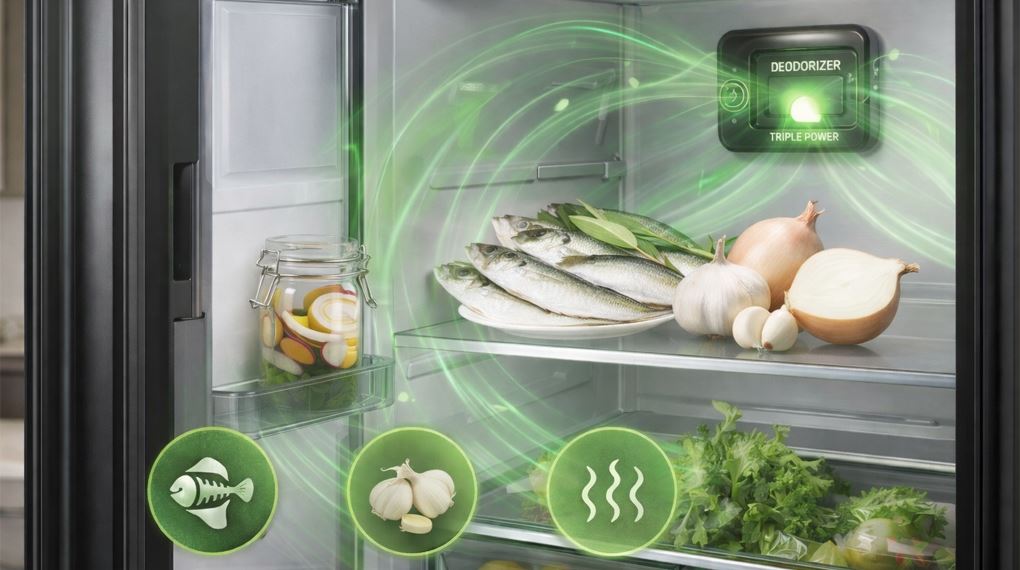 Bộ lọc khử mùi Triple Power hỗ trợ làm sạch không khí bên trong khoang tủ, giúp hạn chế mùi khó chịu khi bảo quản nhiều loại thực phẩm khác nhau, đặc biệt là thực phẩm tươi sống hoặc món ăn nấu sẵn.