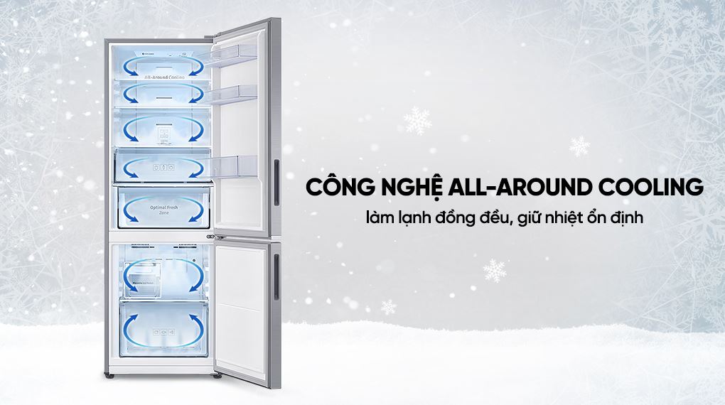 Công nghệ All-around Cooling giúp luồng khí lạnh được phân bổ đồng đều hơn trong tủ, mang lại khả năng giữ nhiệt ổn định cho quá trình bảo quản thực phẩm.