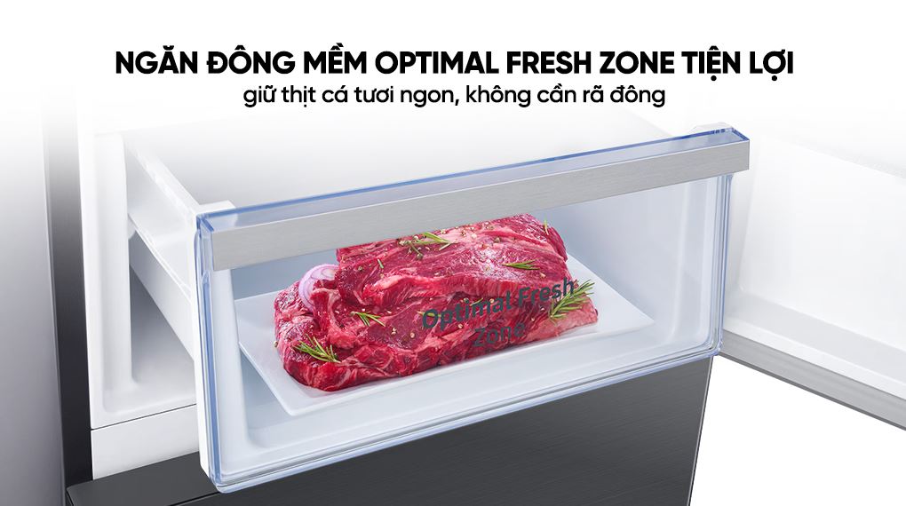 Ngăn Optimal Fresh Zone hỗ trợ bảo quản thịt cá ở trạng thái đông mềm, hữu ích khi bạn cần nấu ăn nhanh và không muốn chờ thời gian rã đông.
