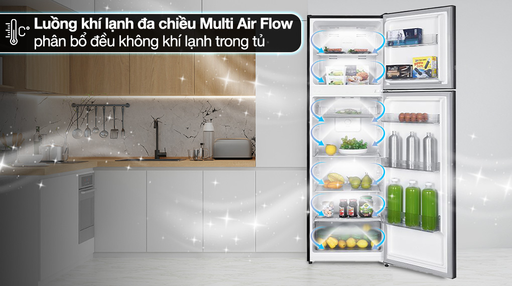 Hệ thống luồng khí lạnh đa chiều Multi Air Flow đưa gió lạnh lan tỏa từ nhiều hướng, giúp không khí lạnh tiếp cận được nhiều vị trí trong khoang tủ, kể cả các góc và khu vực sâu bên trong. Nhờ vậy, thực phẩm ở phía sau hay phía trước kệ đều được làm lạnh tương đối đồng đều, giảm nguy cơ chỗ quá lạnh, chỗ thiếu lạnh.