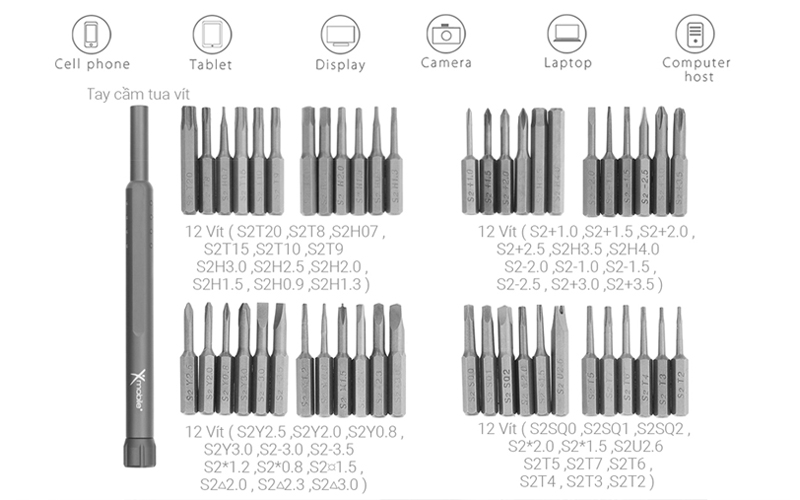 Bộ tua vít Xmobile được thiết kế phù hợp cho hầu hết các loại ốc vít với nhiều dạng như đầu dẹt, 2 lỗ, tam giác, lục giác, 3 cạnh đến 6 cạnh, mỗi dạng đều có đủ kích thước từ lớn đến nhỏ cho người dùng linh hoạt sử dụng.