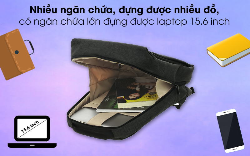 Ngoài ngăn chính đựng laptop 15.6 inch, bạn còn có nhiều ngăn nhỏ để đựng sách, ví tiền, bút, kính mắt, sạc dự phòng,... Với khả năng chịu tải tới 25 kg, người dùng yên tâm đựng mọi món đồ dùng hằng ngày trong balo.