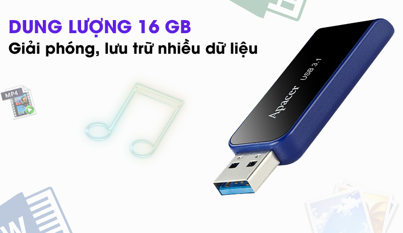 USB Apacer có thể lưu trữ được tới 7.500 hình ảnh với mỗi hình có dung lượng 1.5 MB, bài hát có thể lưu trữ được đến 3.000 bài trong đó mỗi bài tầm 3 MB và nhiều tài liệu khác dễ dàng.