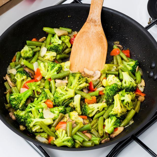 Bạn cho vào chảo nước màu 1 muỗng cà phê hành tím băm, 1 muỗng cà phê tỏi băm đảo đều.