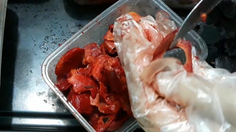 Gấc mua về bạn dùng dao cắt làm đôi rồi dùng muỗng múc ruột gấc ra khỏi quả và cho vào hộp đựng thực phẩm, đậy nắp lại.