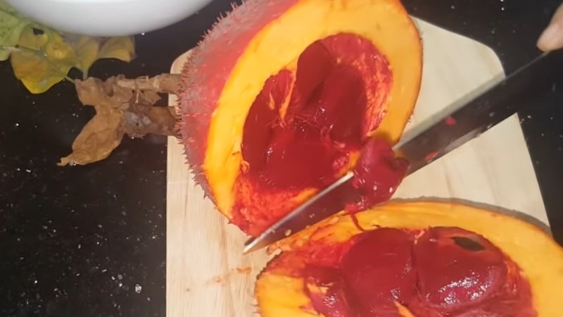 Đầu tiên, bạn dùng dao bổ đôi quả gấc ra.
