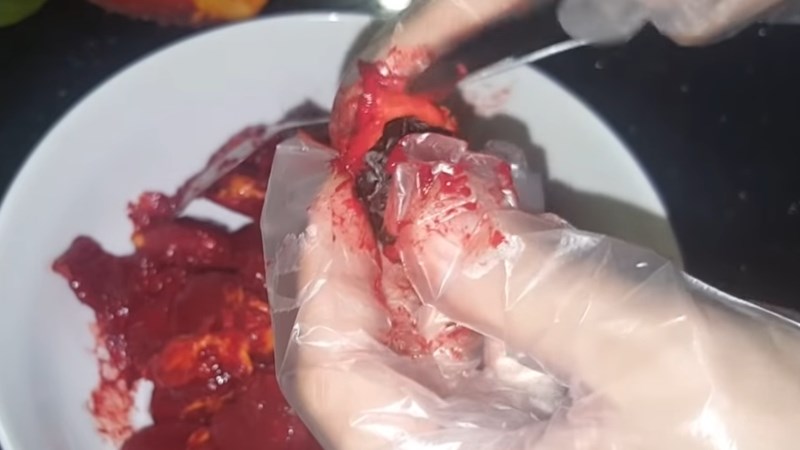 Cuối cùng, dùng đầu mũi dao gọt lấy phần thịt gấc ra khỏi hạt là xong.