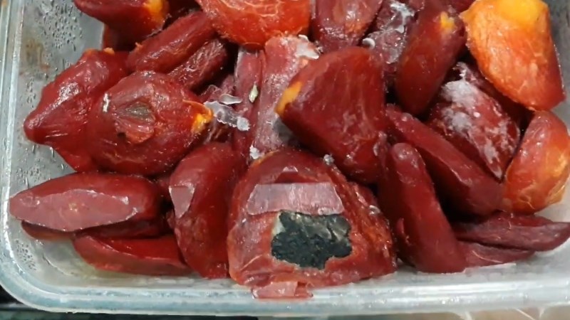 Tiếp theo, bạn cho hộp gấc vào ngăn đông tủ lạnh, bảo quản trong khoảng 2 tiếng cho gấc đông lại.
