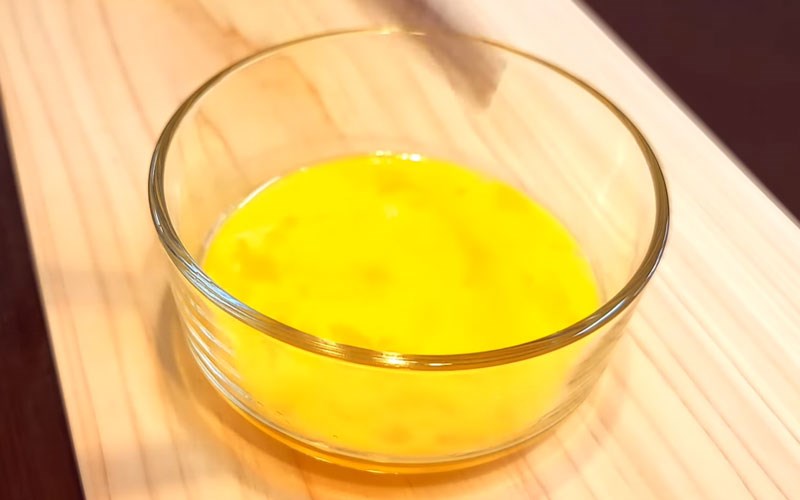 Đầu tiên bạn đập trứng cho vào chén và đánh tan lòng đỏ và lòng trắng với nhau.
